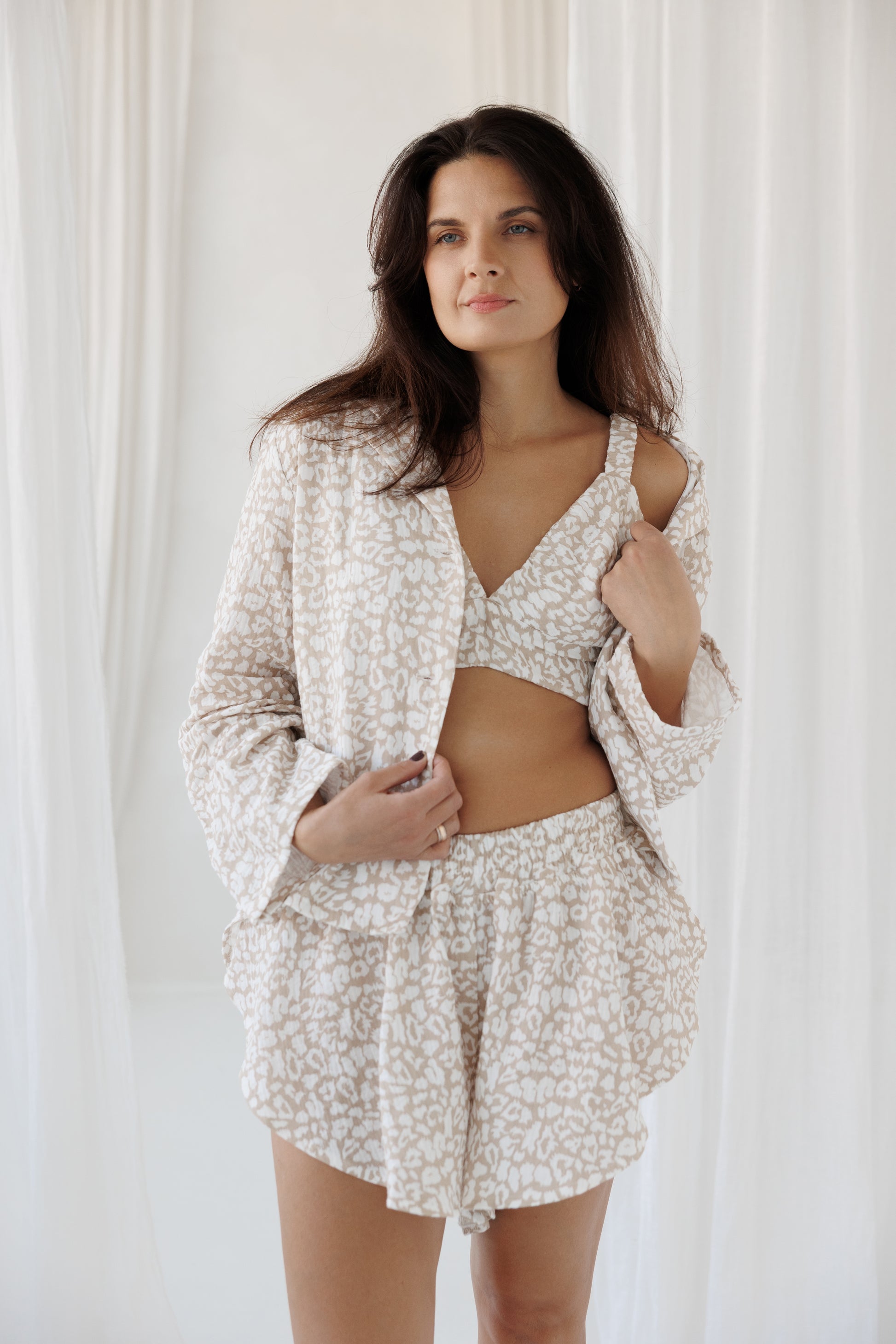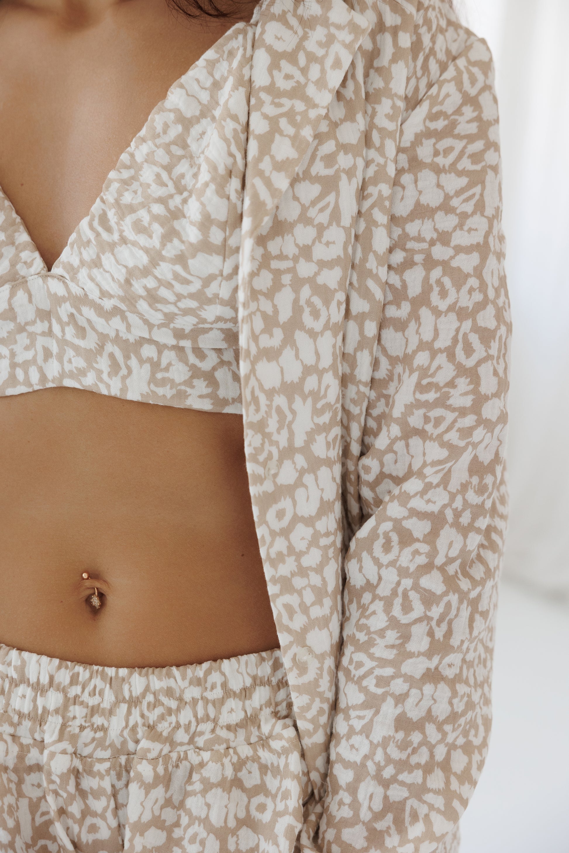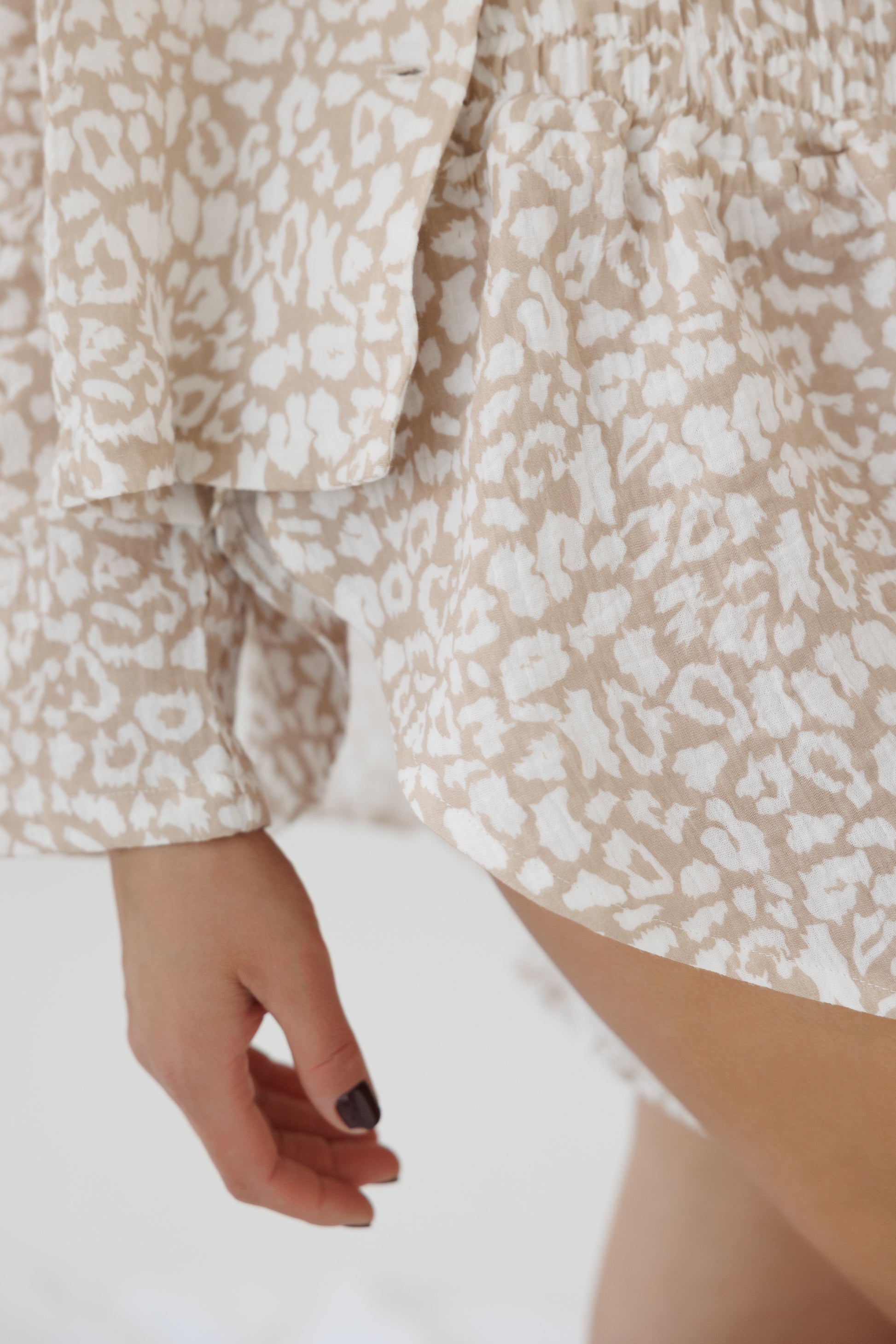 Ši pižama – tarsi švelnus rytinės saulės prisilietimas prie odos. Jos šiltas smėlio ir baltos spalvų derinys, subtiliai įkvėptas laukinio rašto, kuria lengvumo ir natūralumo pojūtį.