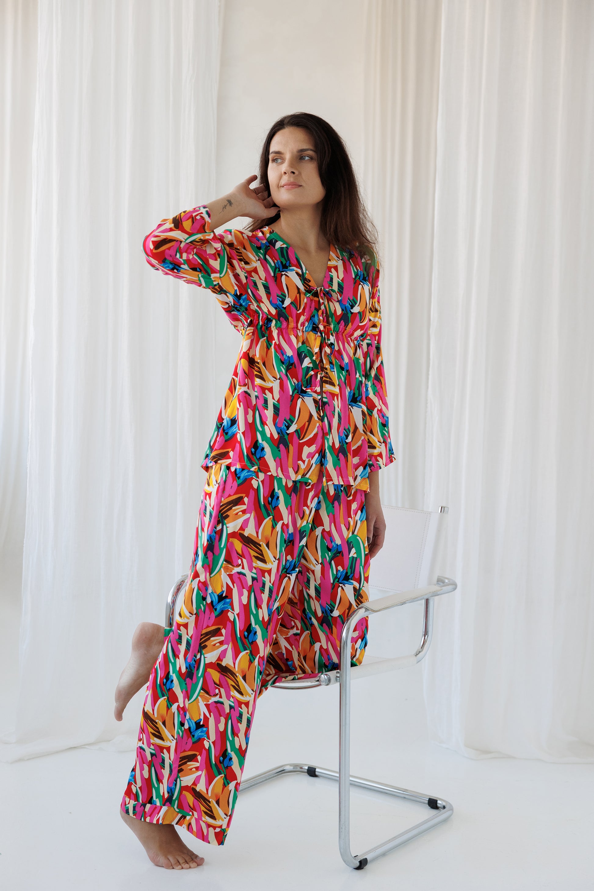 Lengvumo, spalvų ir moteriškumo prisilietimas – tai pižama, skirta moteriai, kuri nori jaustis patogiai ir gražiai tiek dieną, tiek naktį.